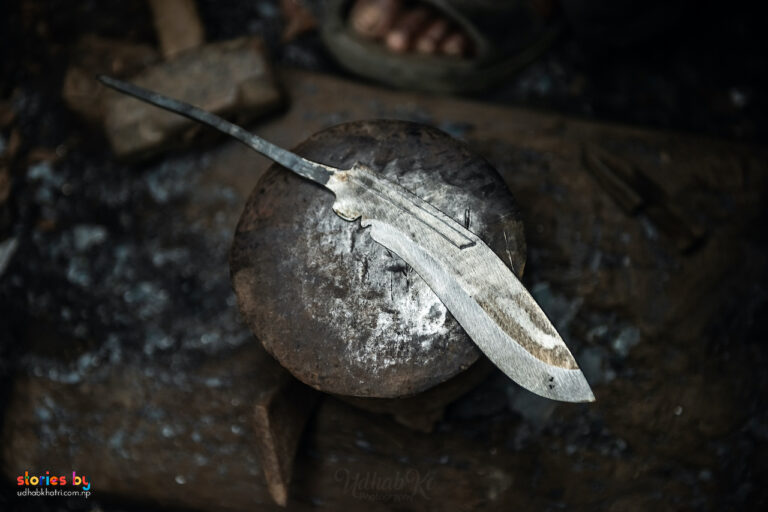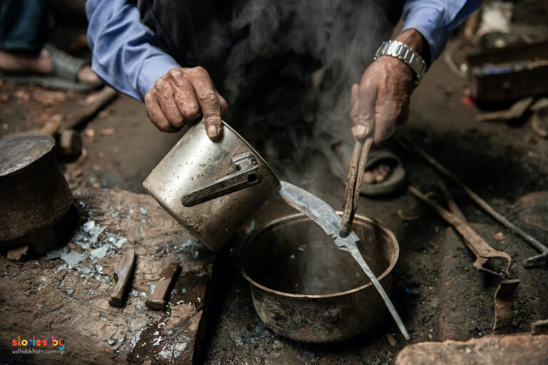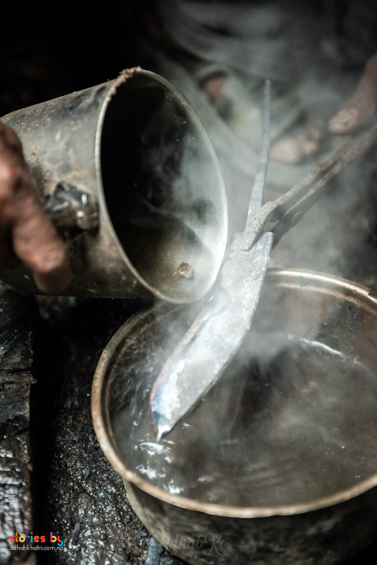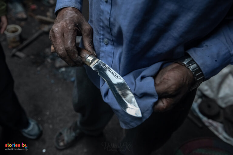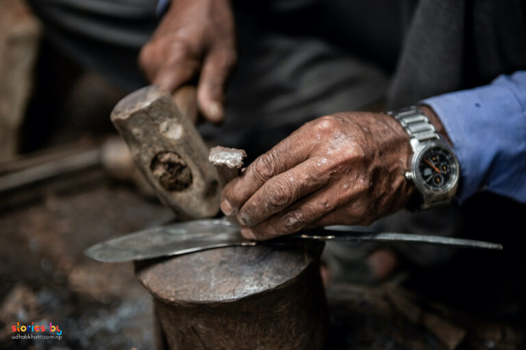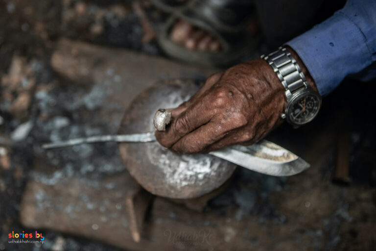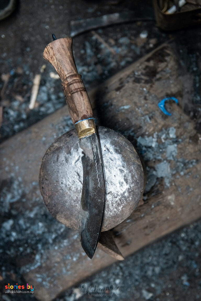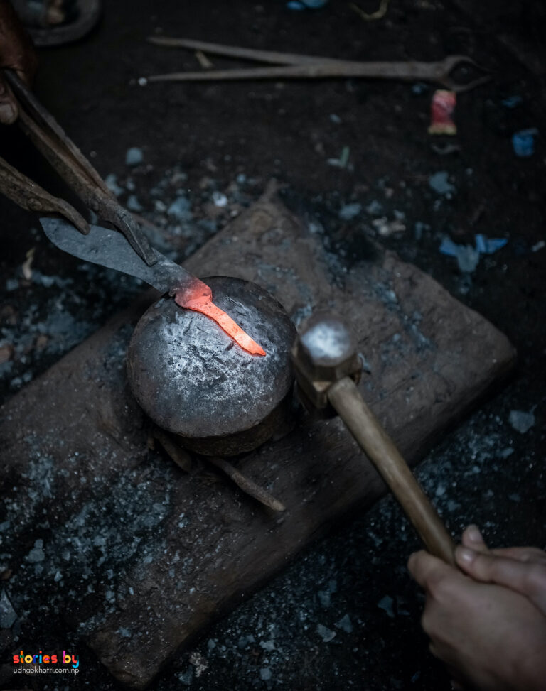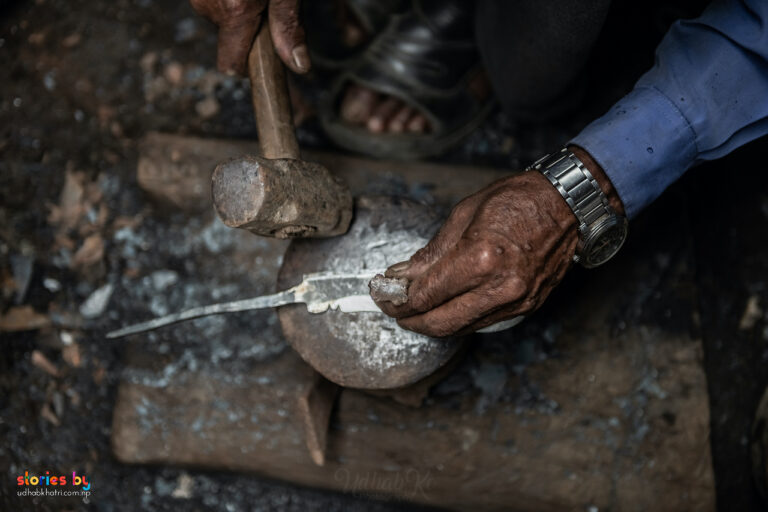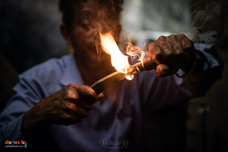 Indra Sunar is making Khukuri in traditional way for more than 40 years, over an open flame in the backyard of his Kathmandu home. The meticulous, centuries-old process of making one of these blades was taught to Sunar by his uncle when he was a teenager.